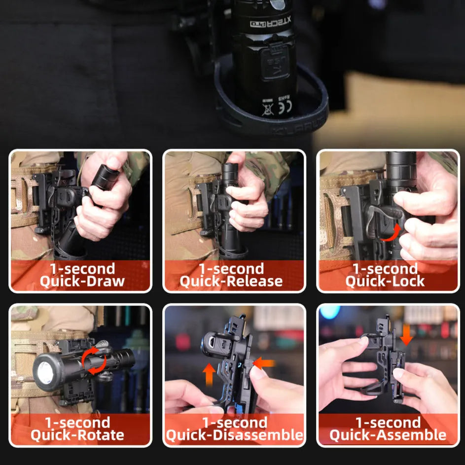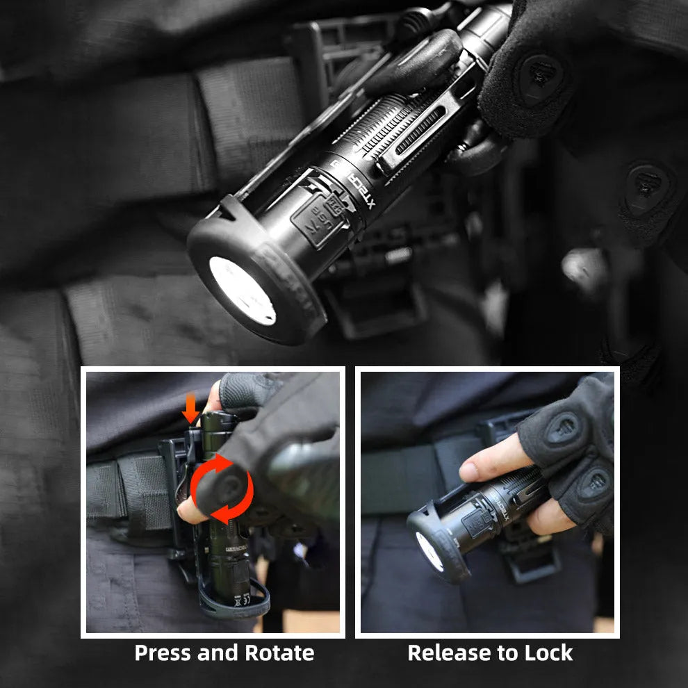 Das Holster lässt sich in verschiedene Winkel drehen und die Taschenlampe kann auch leuchten, wenn sie sich im Holster befindet. Das Anti-Diebstahl-Holster sorgt dafür, dass die Taschenlampe sicher befestigt ist und nicht herausgerissen oder aus dem Holster fallen kann.
