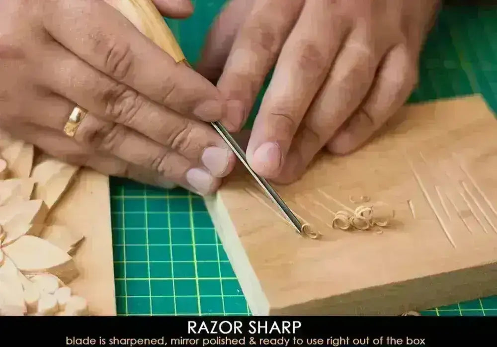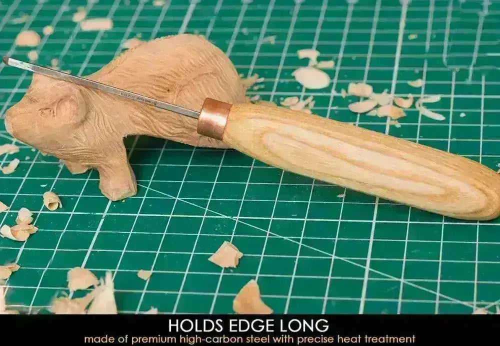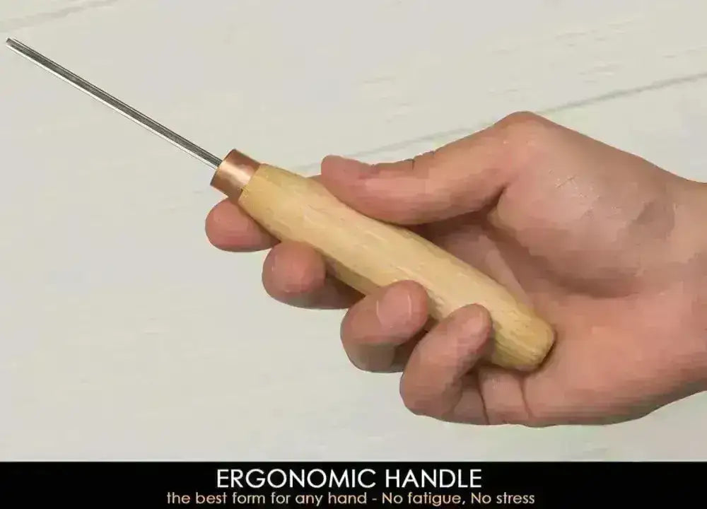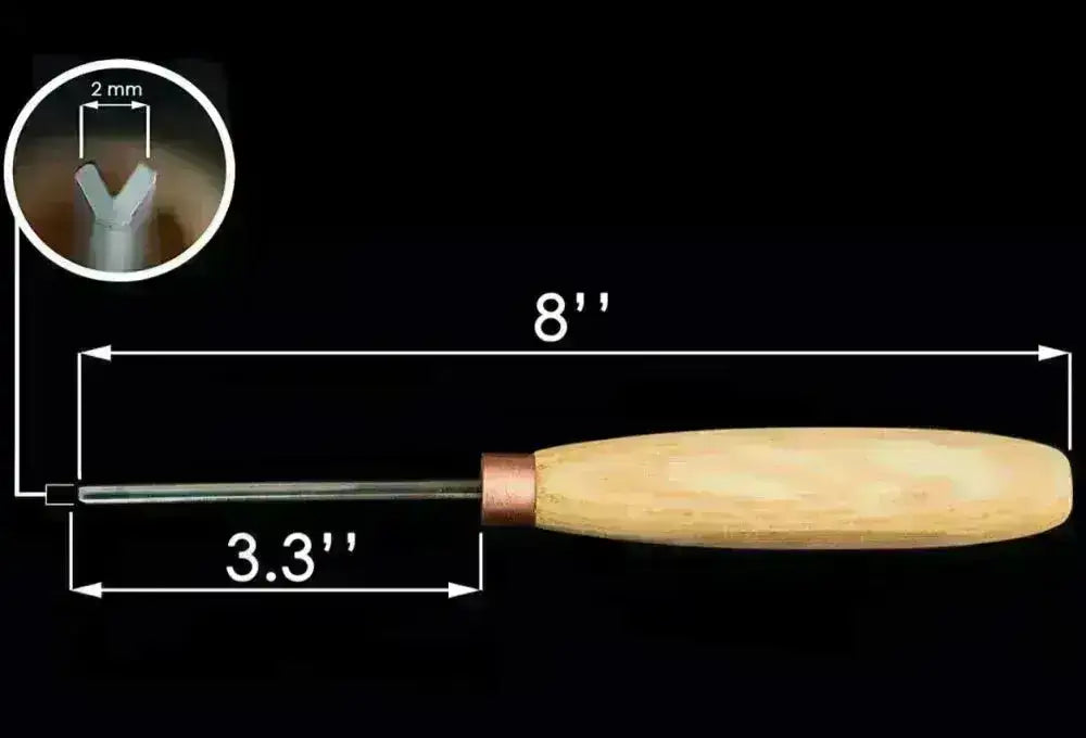 Handgefertigter Meißel aus der Ukraine. K12/02 ist ein scharfes Holzschnitzwerkzeug mit 2 mm Breite und V-Profil mit einem 60-Grad-Winkel, perfekt für Holzschnitzprojekte und ein großartiges Holzbearbeitungswerkzeug für Ihre Tischlerwerkstatt!