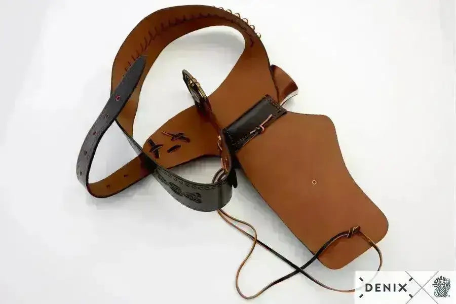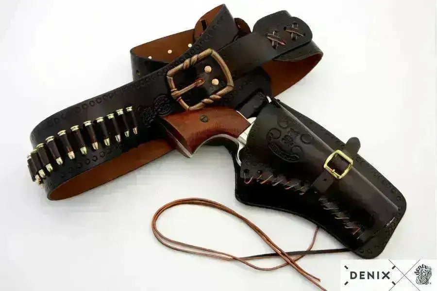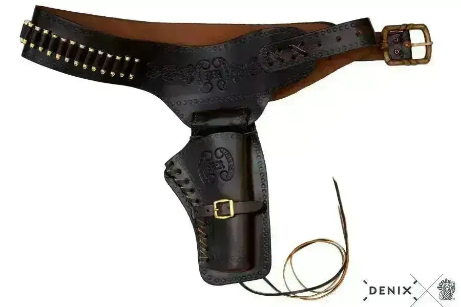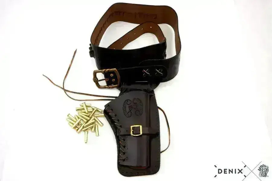 Denix Westerngürtel mit Holster für Rechtshänder. Aus Leder gefertigt und ein hochwertiger Cowboygürtel mit einem Holster auf der rechten Seite.