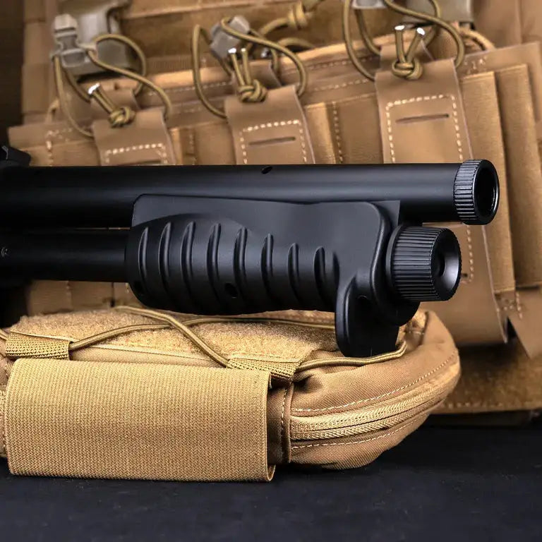 The shotgun is equipped with a 21mm picatinny rail on top, so you can easily mount a red dot sight, flashlight, or other tactical optics. The grip is textured for better control, and the pump is designed with a finger stop for quick and precise repetition.