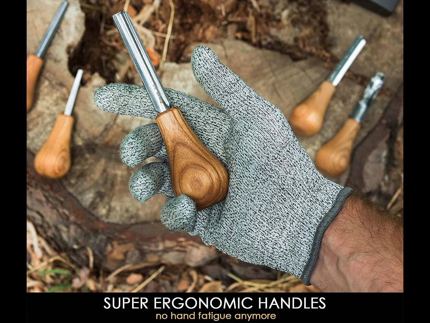 - P9/10 – Palm-handled Wood Carving Gouge (Sweep #9): For detailed wood removal and pattern cutting.