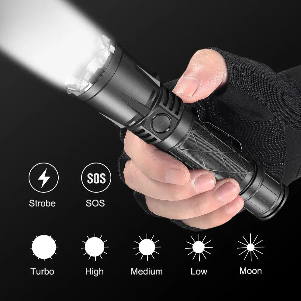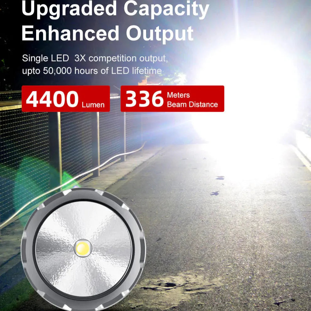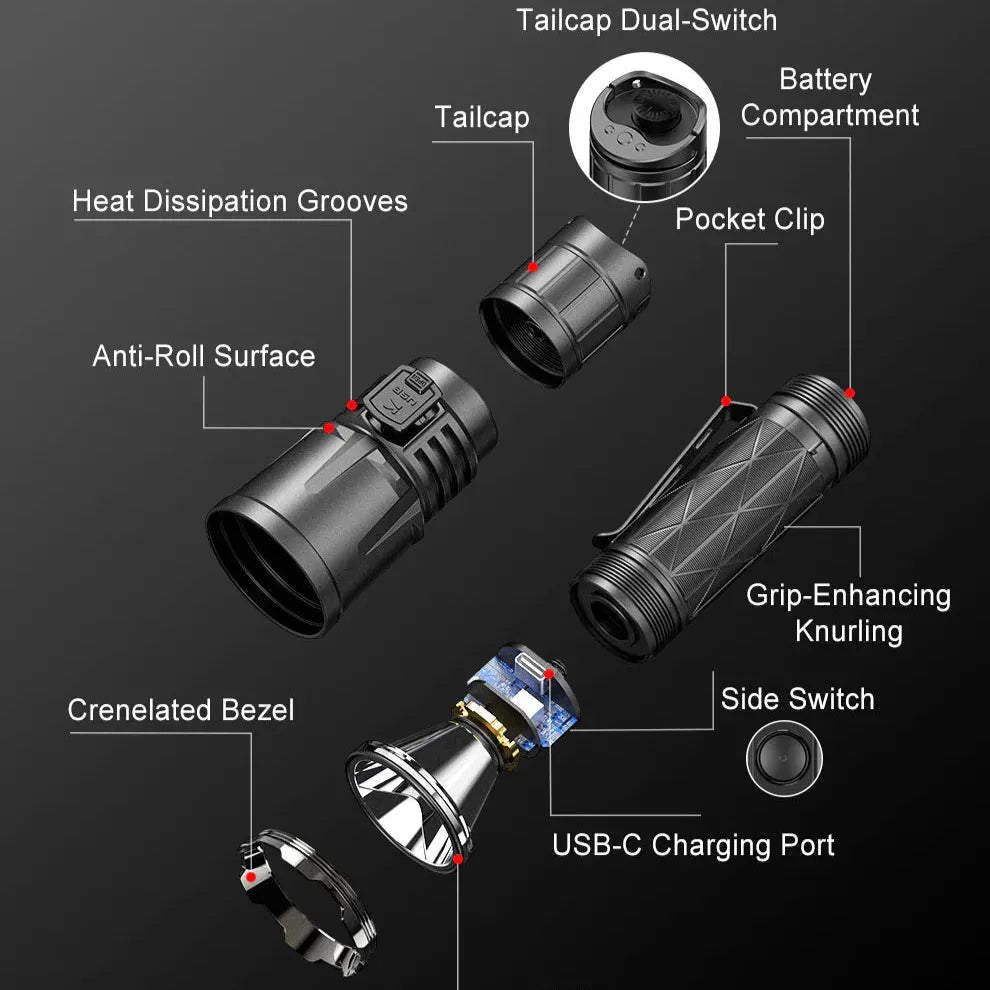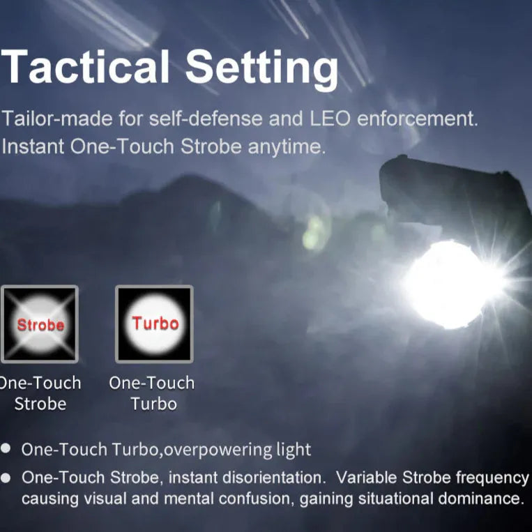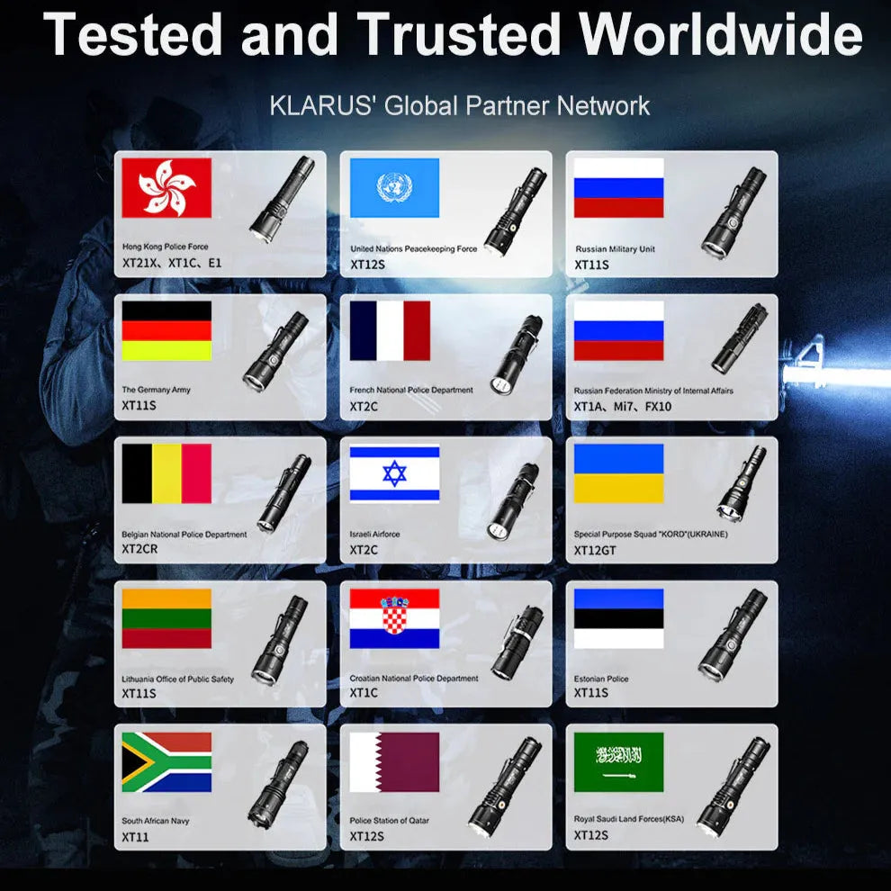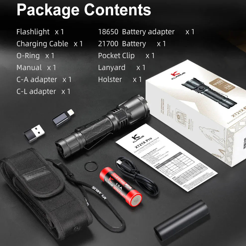 The KLARUS XT21X Pro is a powerful rechargeable tactical flashlight with an impressive brightness of up to 4400 lumens and a range of 316 meters. Perfect for tactical operations, outdoor activities, and emergency use.