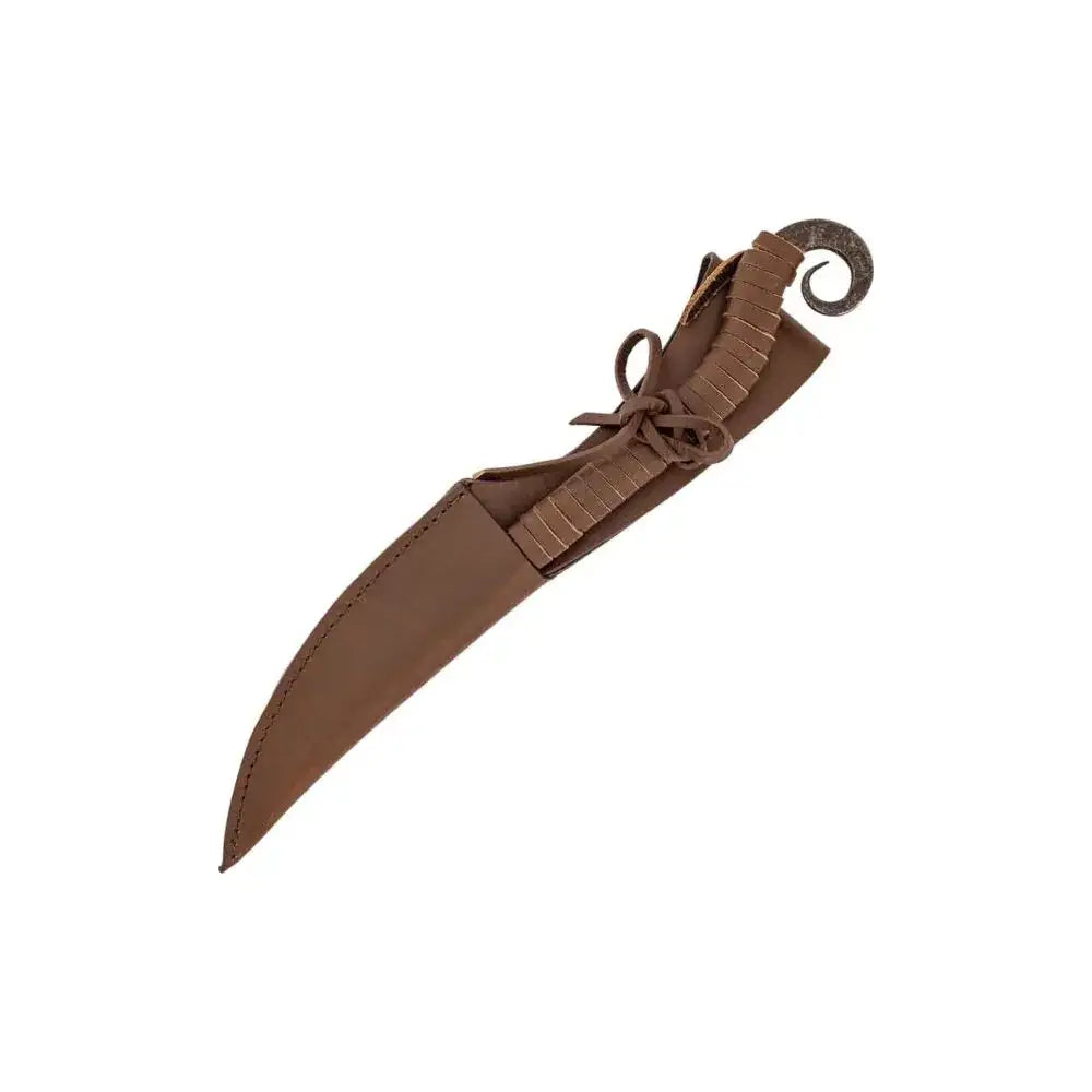 Forestill deg å være ute i villmarken med en pålitelig følgesvenn ved din side – denne håndsmidde middelalderkniven kombinerer tradisjonelt preg med praktisk bruk. Totallengden er ca. 25cm, med et ca. 11,5cm blad i karbonstål som har hamret tekstur og enkel egg. Håndtaket er ca. 14cm langt, viklet med brunt lær for godt grep, og avsluttes med en spiralformet ende som både gir stil og ekstra sikkerhet i hånden. Den leveres med ekte lærslire med snorer for trygg oppbevaring.