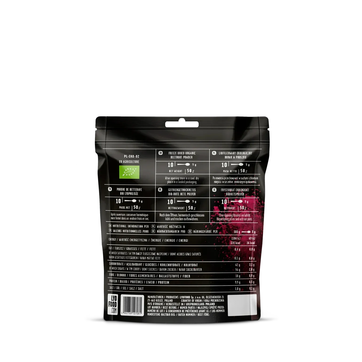 Specifications Weight (net) 50g Origin Poland Ingredient Organic beetroots (100%) Shelf life Up to 2.5 years Benefits 100% organic beetroots – no artificial additives Naturally rich in fiber, iron, and antioxidants Provides natural color and flavor to smoothies and baking Lightweight, compact, and long shelf life Nutritional content (per 100g powder) Energy: 1400kJ / 335kcal Fat: 1.2g (of which saturated fat: 0.1g) Carbohydrates: 66g (of which sugars: 8g) Fiber: 19g Protein: 10g Salt: 0.02g IngredientsOrganic Beetroots (100%) Usage Tips Add to smoothies, porridge, soup, or use in baking for natural energy and vibrant color.