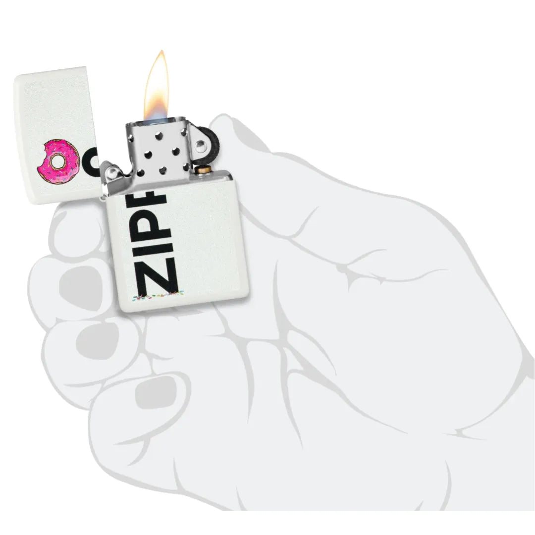 Make a statement with this white matte Zippo lighter featuring a fun and eye-catching design. A sleek frosted donut motif is integrated into the Zippo logo with colorful imaging technique. Perfect as a gift or for personal use. Comes in a gift box.