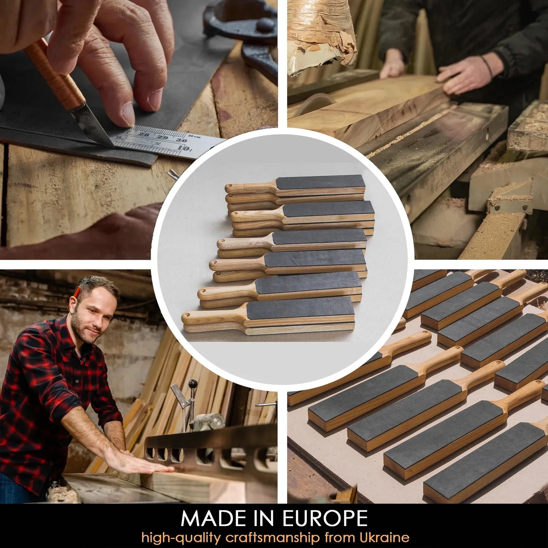 LS6P1 – Double-Sided Leather Strop with Polishing Compound Compact and versatile strop for knife sharpening and maintenance Achieve razor-sharp edges with the LS6P1 – a double-sided leather strop for maintaining all types of knives and axes. Whether it's for wood carving tools, kitchen knives, or outdoor gear, this strop offers precision and efficiency in a compact format. Dual function – coarse and fine surface The strop is equipped with two different sides: Suede side: Perfect for removing burrs and improving sharpness Smooth side: Provides a mirror-like and polished finish This design gives you the flexibility you need to adjust the sharpening as needed. Quality and comfort in one With a base made of solid ash and a surface of genuine cowhide, the strop is built for durability and comfort.The ergonomic handle makes sharpening easy and efficient, without compromising on precision. Included green polishing paste Enhance the result with the included green polishing paste that helps you achieve maximum sharpness. An ideal tool for anyone wanting a professional result at home. Specifications: Blade length: 240mm Total length: 370mm Width: 50mm Material: Cowhide and ash Weight: 30g LS6P1 is the ideal choice for craftsmen, chefs, outdoor enthusiasts, and anyone who wants to maintain the sharpness and lifespan of their blades.