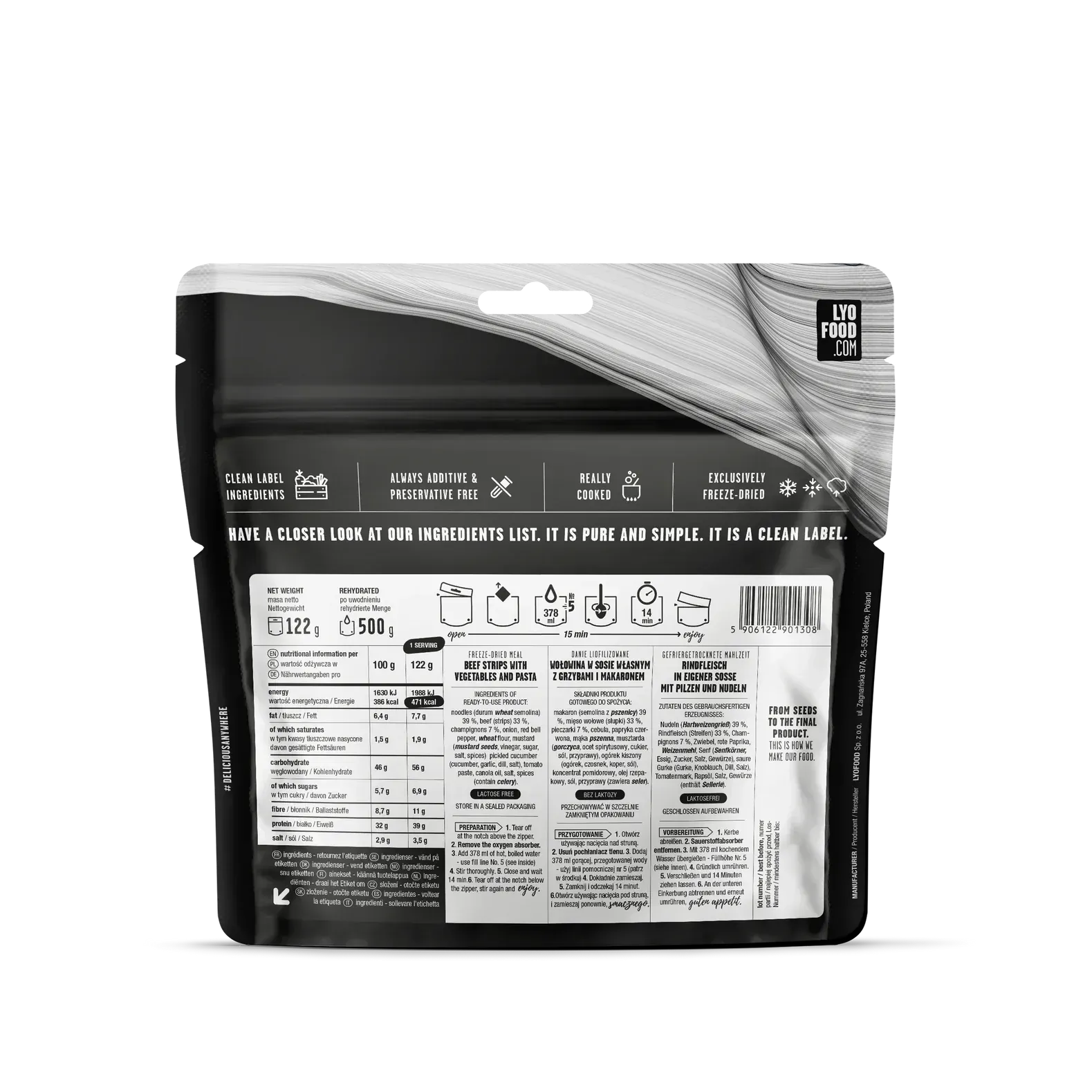 LYOFOOD Beef Stroganoff offers a true taste experience with tender beef pieces, mushrooms, and a creamy paprika sauce. Perfect for those who want a warming and nutritious dinner while on the go. The dish is made with 100% natural ingredients, no preservatives, and freeze-dried for low weight and long shelf life.