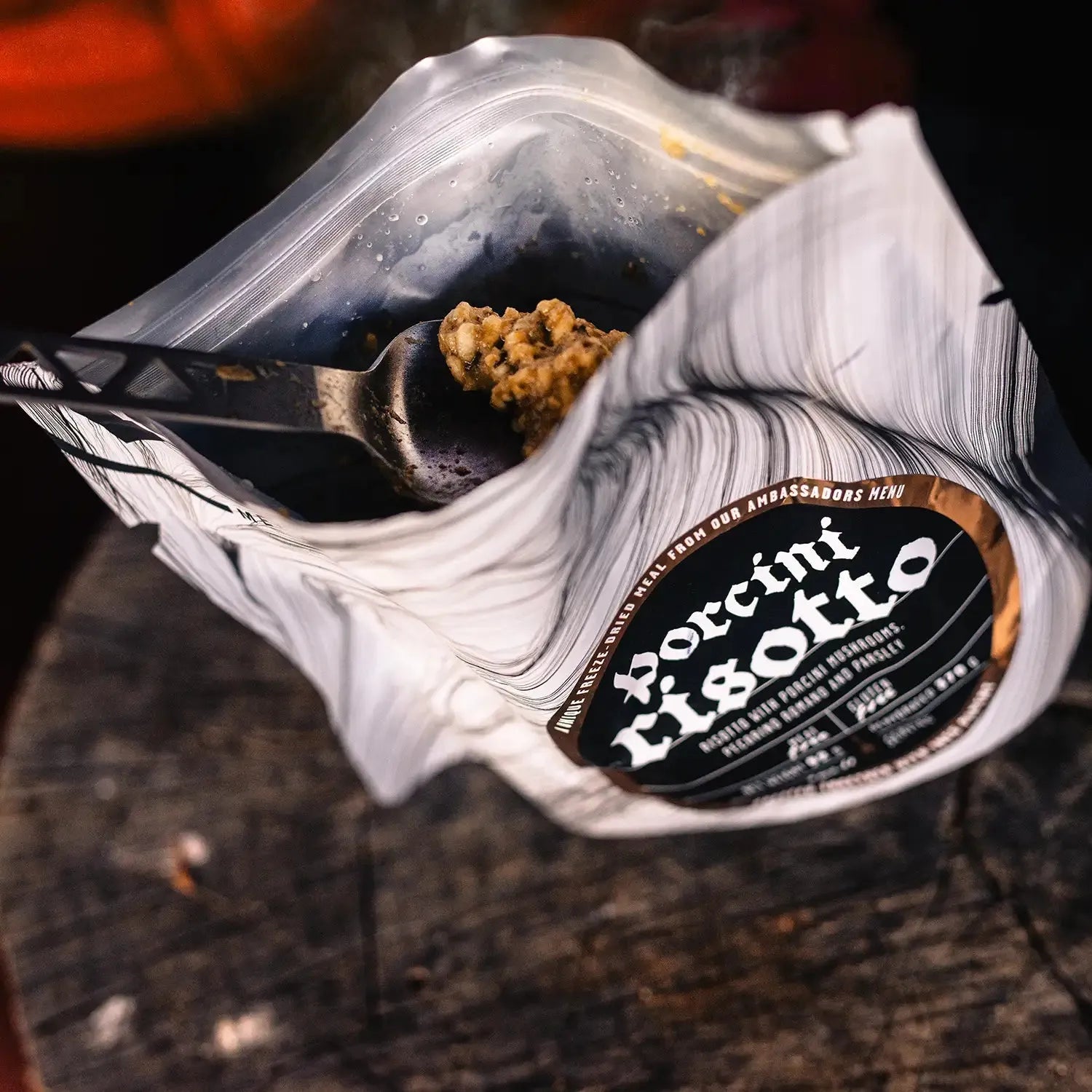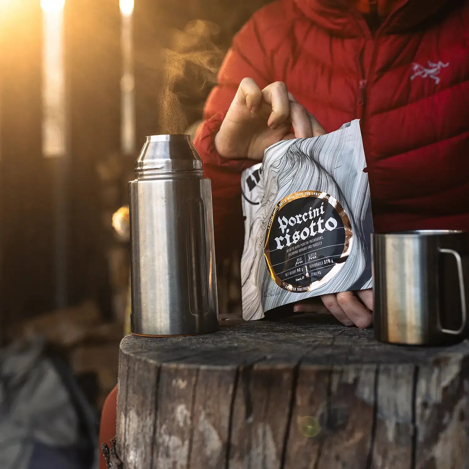 Specifications Weight (net) 90g Prepared weight 430g Servings 1 adult serving Shelf life Up to 5 years Benefits 100% natural ingredients – no preservatives Creamy risotto with the taste of porcini mushrooms and herbs Rich flavor, low weight – perfect for hiking meals Long shelf life and quick preparation Nutritional content (per 100g dry product) Energy: 1803kJ / 432kcal Fat: 17g (of which saturated fat: 7g) Carbohydrates: 55g (of which sugars: 5g) Fiber: 2g Protein: 11g Salt: 2.3g IngredientsRice (50%), water, porcini mushrooms (15%), onion, carrot, cream (milk), canola oil, white wine, butter (milk), parsley, salt, garlic, black pepper