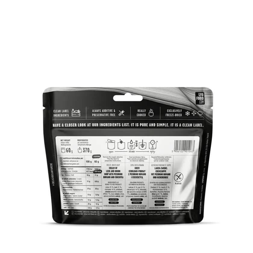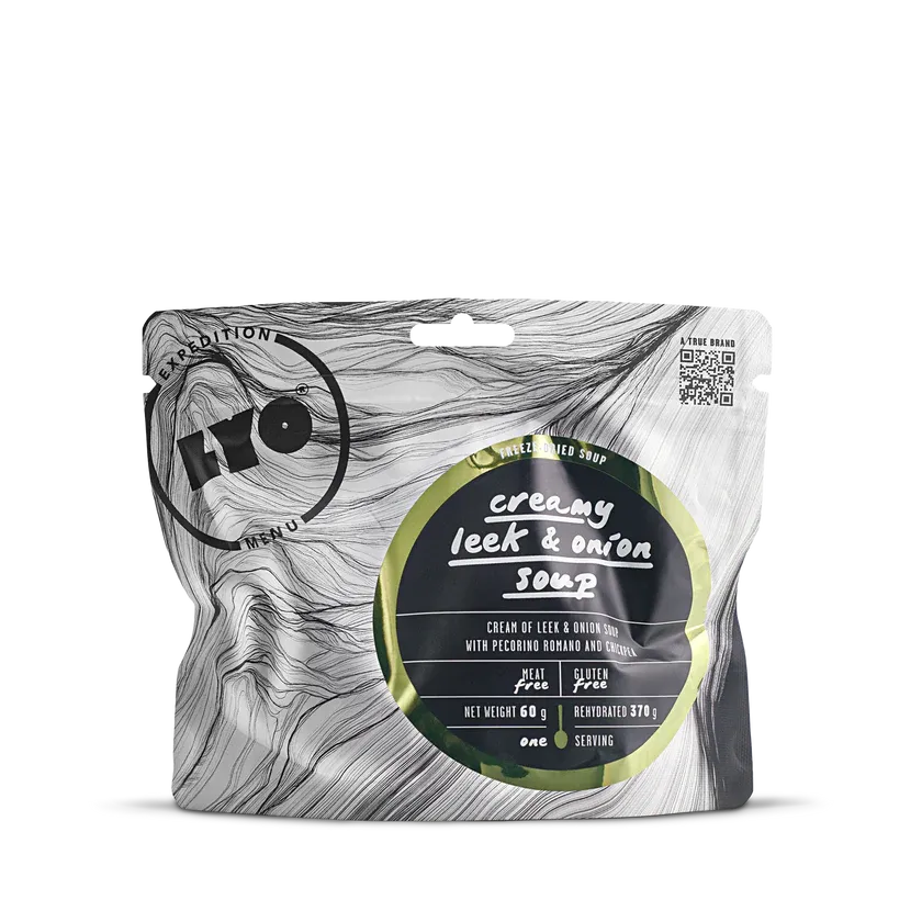 LYOFOOD Creamy Leek & Onion Soup – Gluten-Free Creamy Soup for Hiking Warm, mild, and nutritious – ready in minutes LYOFOOD Creamy Leek & Onion Soup combines mild leeks and onions in a creamy, warming soup. Made from 100% natural ingredients, completely free of gluten or artificial additives. This light meal soup is perfect as dinner, a snack, or an appetizer on mountain hikes, expeditions, or camping trips.Specifications Weight (net) 60g Prepared weight 320g Servings 1 adult serving Shelf life Up to 5 years Benefits 100% natural ingredients – no artificial additives Gluten-free and vegetarian Creamy and mild flavor – ideal for cold days Low weight and quick preparation Nutritional content (per 100g dry product) Energy: 1650kJ / 394kcal Fat: 10g (of which saturated fat: 2g) Carbohydrates: 50g (of which sugars: 5g) Protein: 12g Salt: 2.2g Ingredients