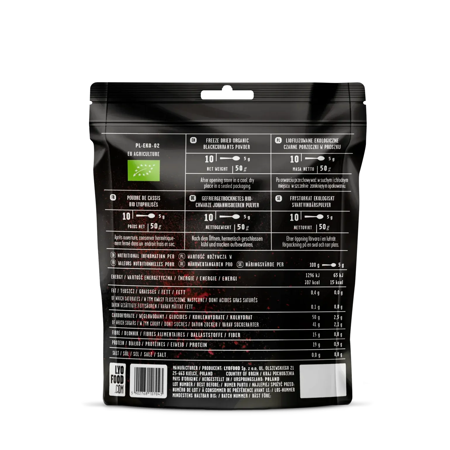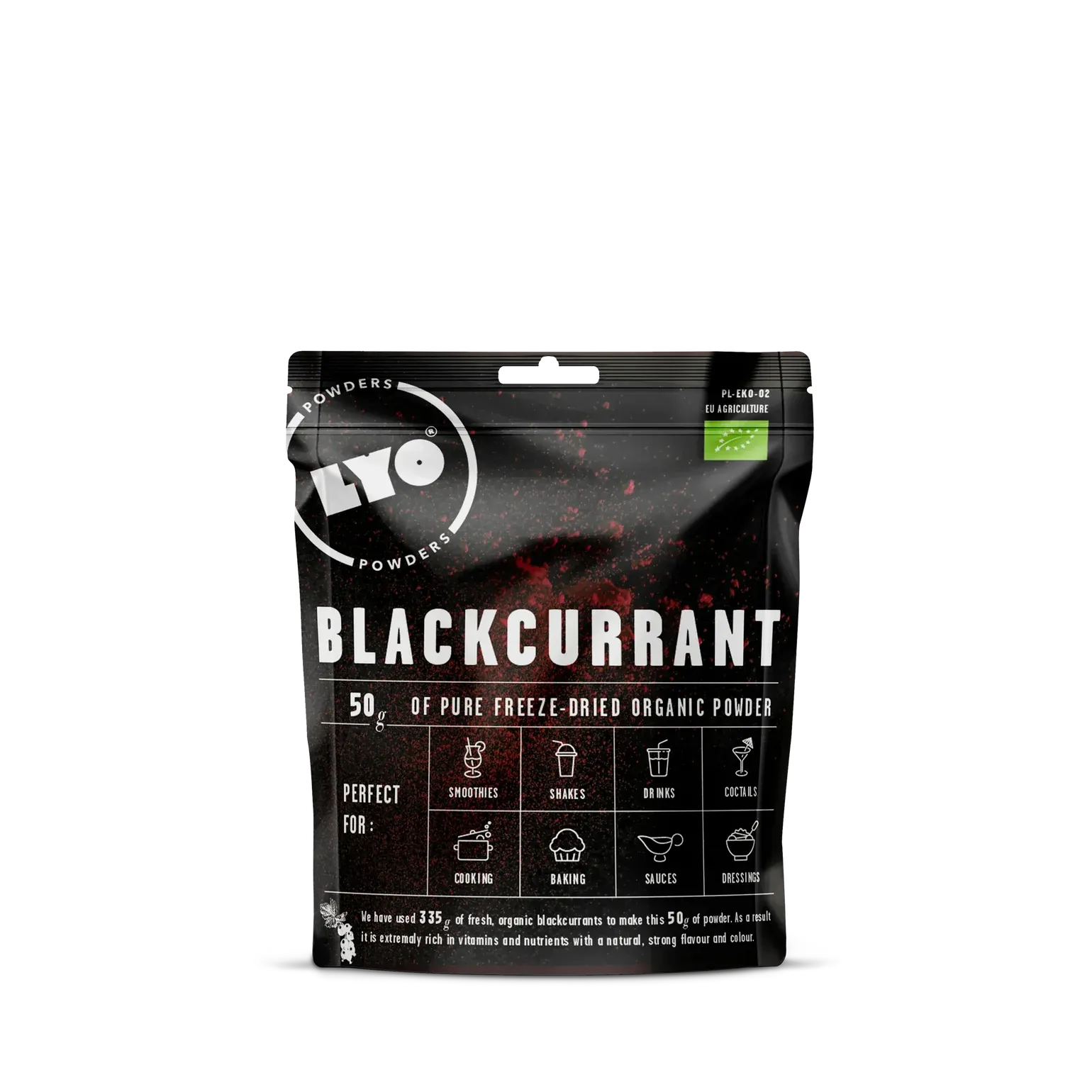 LYOFOOD Organic Blackcurrant Powder – Superfruit for smoothies, porridge, and baking Natural powerhouse – rich in vitamin C and antioxidants LYOFOOD Blackcurrant Powder brings the powerful taste and nutrition of blackcurrants right to your breakfast or trail food. The powder is made from fresh, organic blackcurrants, gently processed to preserve all the essential nutrients. Perfect for smoothies, porridge, yogurt, or baking when you want a natural boost of flavor and energy all year round.Specifications Weight (net) 50g Origin Poland Ingredient Organic blackcurrants (100%) Shelf life Up to 2.5 years Benefits 100% organic blackcurrants – no artificial additives Naturally rich in vitamin C, fiber, and antioxidants Powerful taste – perfect for smoothies and baking Long shelf life – lightweight and convenient for hiking Nutritional content (per 100g powder) Energy: 1440kJ / 343kcal Fat: 1.6g (of which saturated fat: 0.1g) Carbohydrates: 70g (of which sugars: 41g) Fiber: 18g Protein: 6g Salt: 0.02g Ingredients