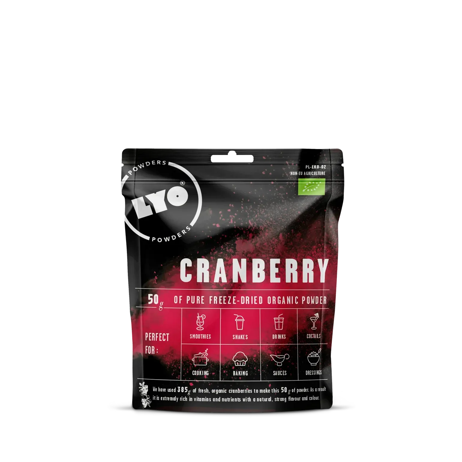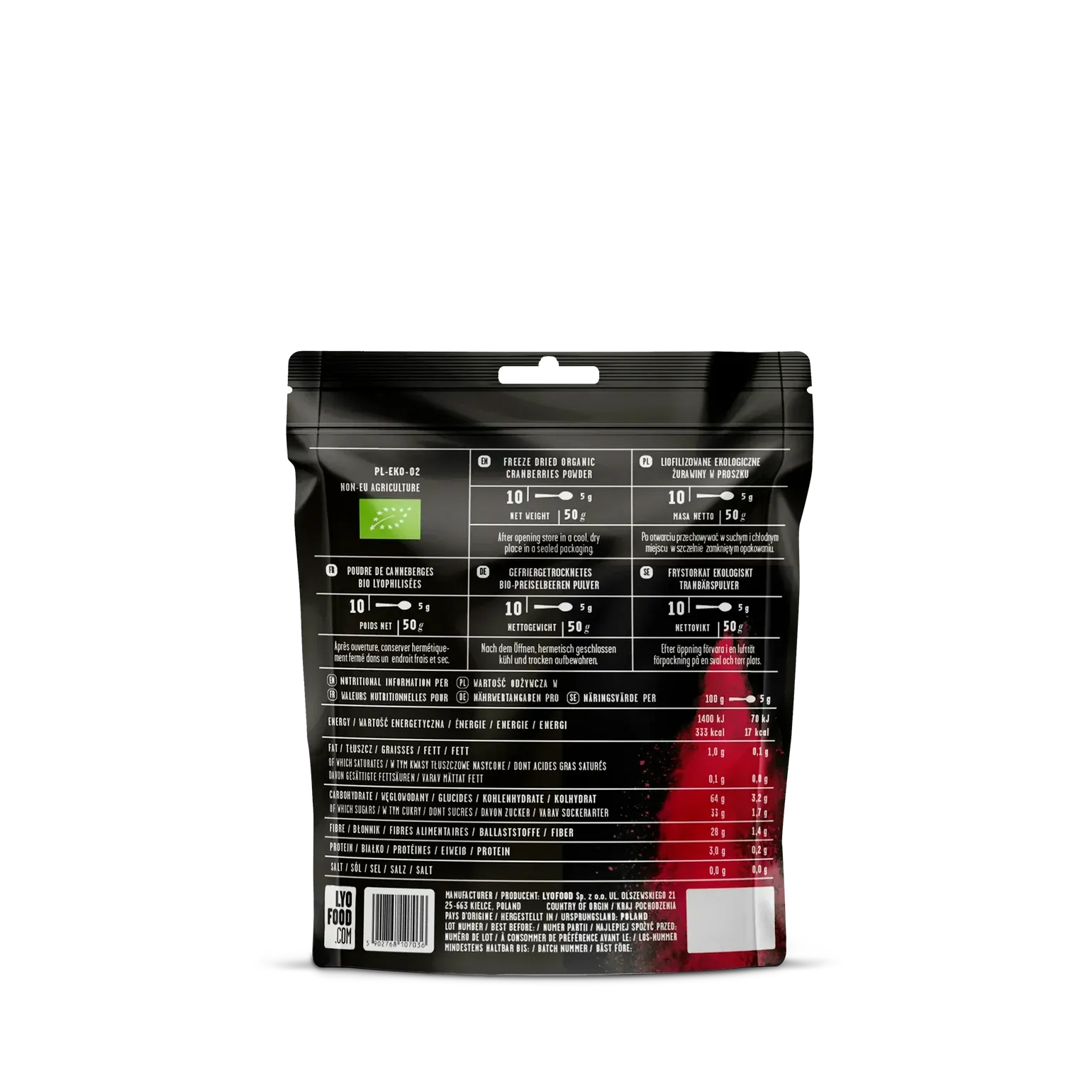 Specifications Weight (net) 50g Origin Poland Ingredient Organic cranberries (100%) Shelf Life Up to 2.5 years Benefits 100% organic cranberries – no artificial additives Rich in vitamin C and antioxidants Perfect for smoothies, porridge, and baking Lightweight and long shelf life Nutritional Content (per 100g powder) Energy: 1420kJ / 339kcal Fat: 1.5g (of which saturated fat: 0.1g) Carbohydrates: 68g (of which sugars: 32g) Fiber: 16g Protein: 6g Salt: 0.02g Ingredients Organic cranberries (100%)Usage Tips