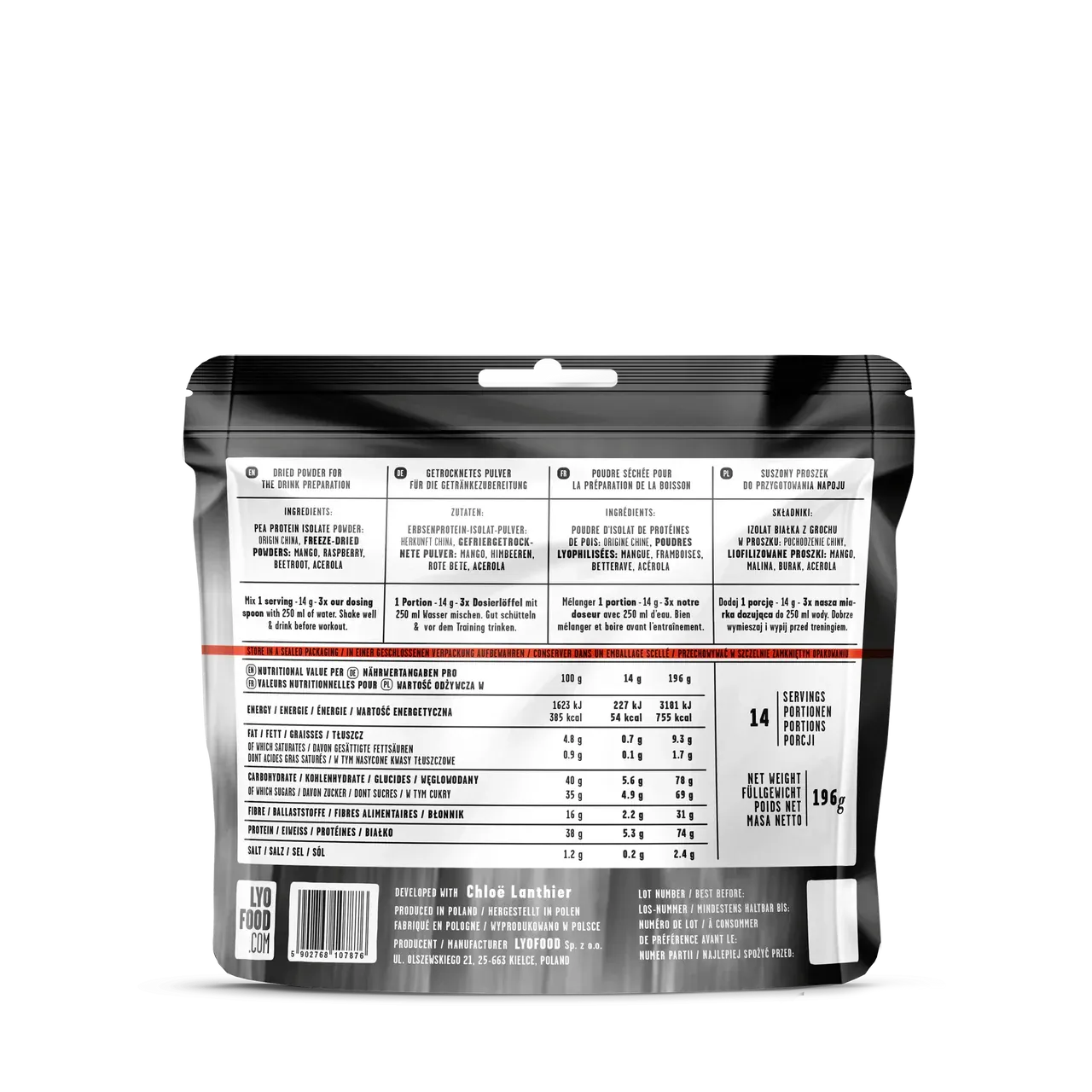 LYOFOOD Speed Formula is a plant-based, freeze-dried sports drink designed to provide quick energy before training or competition. With ingredients like pea protein isolate, mango, raspberry, beetroot, and acerola, it helps to increase muscle glycogen stores and improve nerve and muscle function thanks to a high content of calcium and magnesium.