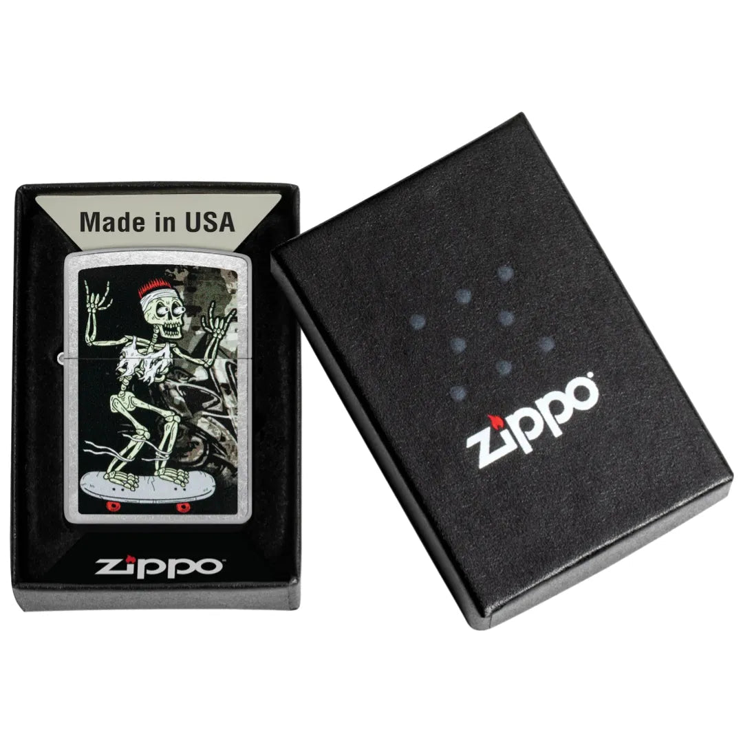 An iconic Zippo lighter with a cool "Skating Skeleton" design printed on a classic Street Chrome surface. Perfect for skate enthusiasts and collectors. The Zippo lighter comes in a gift box and works best with Zippo fuel.