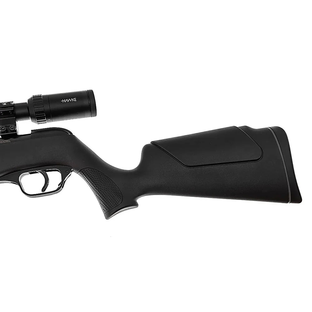Det riflede løpet på 485mm er optimalisert for diaboler og gir stabil kulegang. Riflen leveres med fiberoptiske åpne sikter som gir god synlighet mot målet under ulike lysforhold.