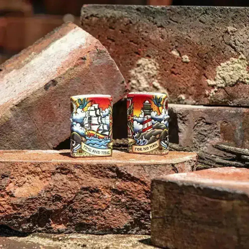 So cast off and hoist the jib, because this Zippo with a cool old school tattoo design is perfect for the collection or for an old sea dog.