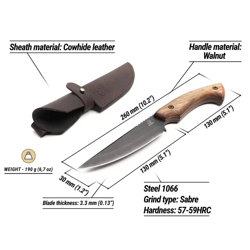 Der Griff besteht aus europäischem Nussbaumholz und ist für einen guten und sicheren Halt geformt. Die Befestigung erfolgt mit soliden Metallnieten und die Konstruktion lässt sich bei Bedarf problemlos demontieren.