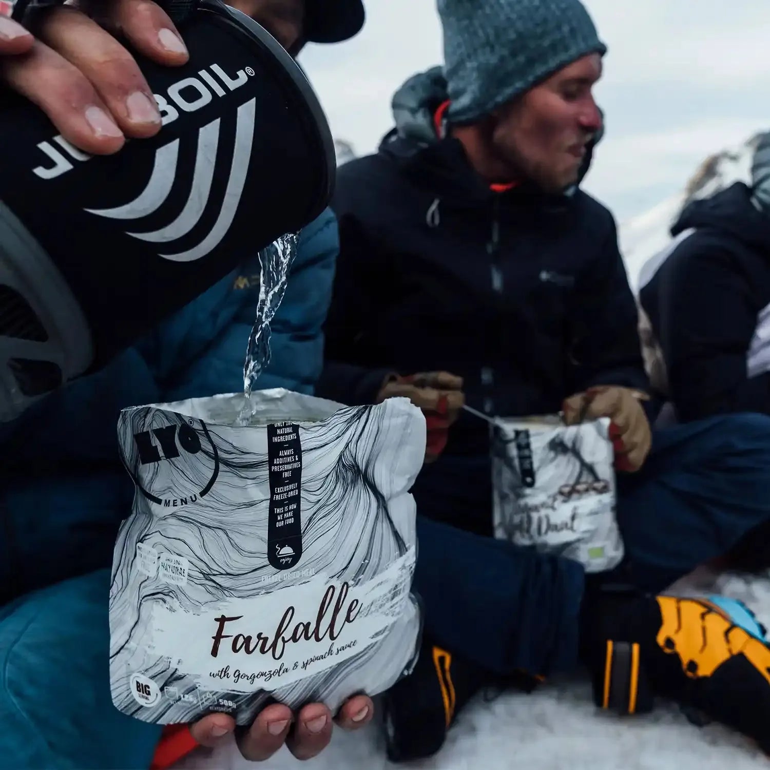 Geben Sie kochendes Wasser direkt in den Beutel, rühren Sie gut um und warten Sie 8–10 Minuten. Genießen Sie auf einer Wanderung, Expedition oder im Basislager ein warmes und cremiges Nudelgericht.