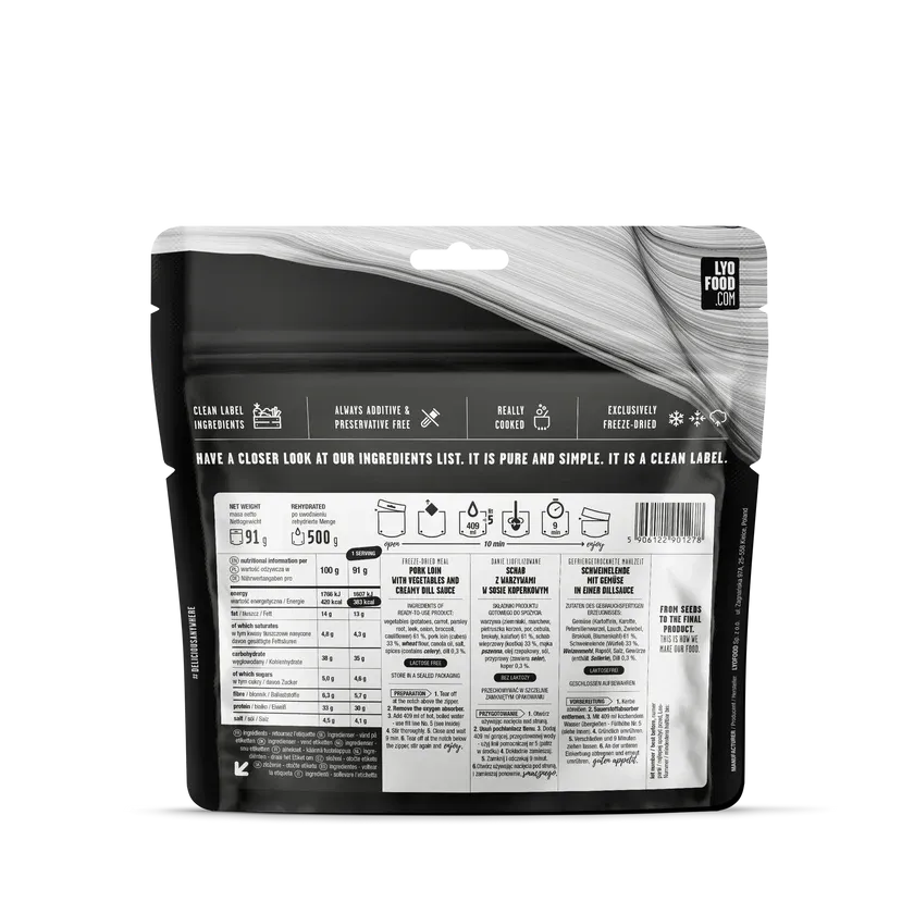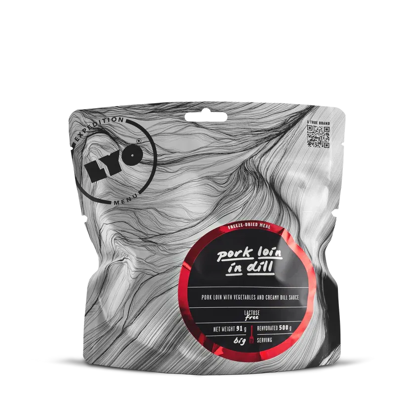 LYOFOOD Schweinelende in Dillsauce ist ein schmackhaftes Abendessen mit Schweinefleisch und Kartoffeln in einer milden, würzigen Dillsauce. Das Gericht besteht zu 100 % aus natürlichen Zutaten – ohne künstliche Zusatzstoffe – und ist laktosefrei. Es bietet ein reichhaltiges und sättigendes Erlebnis, perfekt für Wanderungen, Expeditionen oder den Einsatz im Gelände, wo Sie gutes Essen mit geringem Gewicht und langer Haltbarkeit benötigen.